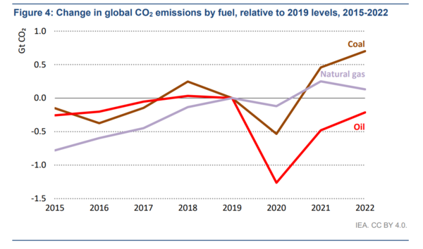우크라이나 전쟁 등으로 인해 천연가스 사용으로 인한 탄소배출량은 1.6%(1억1800만톤) 감소했다. 특히 유럽 지역에서 13.5% 감소했다. 아시아·태평양 지역에서도 LNG 현물 가격이 급등하면서 1.8% 줄었다. 반면 미국과 캐나다에서는 천연가스 수요가 줄지 않으면서 천연가스 사용으로 인한 배출량은 전년 대비 5.8% 증가했다.