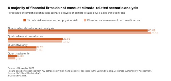 S&P 글로벌은 저탄소 경제와 기후 복원력을 향한 산업 동향을 측정한 보고서를 매 분기 발간한다. 2022년 지속 가능성 평가 데이터에 따르면, 금융기관 중 25%만이 공급망 내 배출량 감축 목표를 설정하거나 대출 또는 투자 포트폴리오를 기후 목표와 연계했다. 또한 금융기관 대다수가 기후 리스크에 대한 시나리오도 분석하지 않은 것으로 나타났다.
