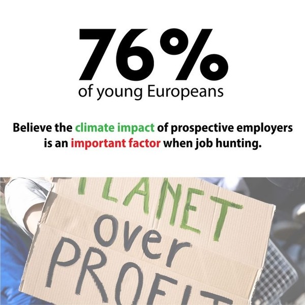 조사 결과, 매년 점점 더 많은 사람들이 구직 활동을 할 때 고용주의 기후변화 대응을 눈여겨 보고 있는 것으로 나타났다. 유럽 응답자의 62%는 고용주가 지속가능성을 우선시하는 것이 중요하다고 답했다. 유럽인의 16%는 지속가능성이 최우선 과제라고 말하기도 했다. 일을 하기 시작하는 20~29세의 사람 중 76%가 지속 가능성이 고용주 선택에 중요한 요소라고 말했으며 22%는 이것이 최우선 순위라고 말한 것으로 알려졌다.