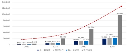 이를 토대로 연간 재활용될 폐배터리 양을 추정한 결과, 2030년 1만8000톤(4만개), 2035년 9만톤(18.4만개), 2040년 22만5000톤(40.6만개), 2045년엔 41만6000톤(63.9만개)으로 나타났다. 즉, 폐배터리 41만6000톤에서 수산화리튬 2만톤, 황산망간 2만1000톤, 황산코발트 2만2000톤, 황산니켈 9만8000톤이 회수될 수 있는 것이다.