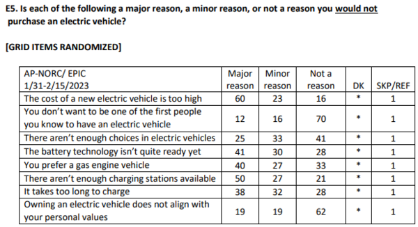 시카고 대학교의 설문에 따르면 미국인의 47%가 “다음 차량 구매 시 전기차를 선택하지 않겠다”고 답변했다. 다음 차량 구매 시 전기차를 살 가능성이 ‘높다’ 혹은 ‘매우 높다’ 라고 답변한 응답자는 19%에 불과했다.