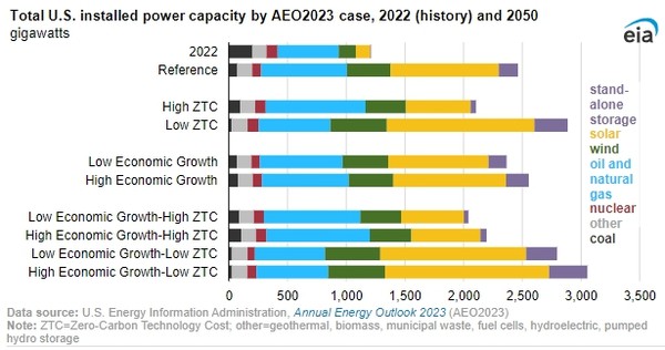 한편, 화석 연료 생성 용량에 대한 예상 결과도 AEO2023 시나리오에 따라 달라진다. 고경제 성장과 고탄소 기술 비용의 결합 시나리오에서 화석 연료 용량은 2022년에서 2050년 사이에 36% 증가한다. 반면, 저경제 성장과 저탄소 기술 비용의 결합 시나리오의 경우 화석 연료 용량은 예상 기간 동안 건설된 것보다 더 많은 화석 연료 발전기가 폐기되기 때문에 14% 감소한다.