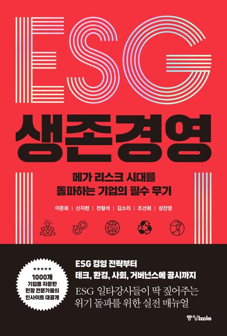 《ESG 생존 경영》은 ESG 각 분야의 전문가 6인이 각각 1장씩 집필하여 총 6개의 장으로 구성되어 있다. 1장에서는 대한상공회의소, KOTRA 등 ESG 산업계 인사이트는 물론 정부 정책까지도 제언하는 법무법인 지평 ESG센터 이준희 전략그룹장이 국제통상까지 아우르는 ESG 패러다임 변화와 리스크 시대에 기업이 생존, 성장하기 위한 ESG 경영 방정식을 안내한다. 2장에서는 글로벌 IT기업에서 10년 이상 CSR을 담당하고, 스타트업에서 CSO로 기업내 ESG 내재화를 경험한 신지현 작가가 IT기술의 급격한 발전으로 인한 산업 간 경계가 융화되는 ‘빅블러’ 시대에 ESG 경영을 위해 어떻게 또 다른 성장을 만들어 갈지에 대한 미래지향점을 담았다. 3장은 ESG 중 가장 높은 관심사이자 당면과제인 환경 영역에 대한 내용이다. 친환경 인증과 글로벌 고객사 의뢰로 우리나라 중소ㆍ중견기업 환경 실사를 전문으로 하는 글로벌 인증기관의 전형석 부문장이 스코프3의 부상과 전과정평가, 탄소중립 고도화 등 실무자에 필요한 내용을 설명했다. 4장에서는 노동법, 갈등관리 및 위험성 평가 전문 공인노무사이자 노무법인 조율 김소리 대표가 ESG의 사회 영역인 ‘인권경영’에 대해 설명한다. 5장은 거버넌스 중 특히 컴플라이언스에 집중한다. 이 장은 대한변호사협회 ESG특별위원회 위원이자 법무법인 디라이트 ESG 그룹장 조선희 변호사가 기업 경영 시 발생할 수 있는 법적 리스크를 설명한다. 마지막 6장은 우리나라 정부의 상장사 및 공공기관 공시의무에 힘입어 많은 관심이 몰리고 있는 ‘공시’ 영역이다. 다양한 기업의 ESG 공시 자문 경험을 보유한 국내 표준 전문기관의 성진영 수석전문위원이 차별화된 ESG 공시의 기획 기술은 물론 공시를 통해서 ESG 전략 및 계획 수립까지 역으로 선순환을 만들어 낼 수 있는 인사이트를 가이드한다.