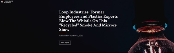 '제2의 테슬라'로 불리던 수소트럭 스타트업인 니콜라(Nikola)가 수소트럭을 생산할 핵심 기술을 보유하지 않는다고 폭로해 장중 주가를 56.2%%까지 급락시키고 CEO까지 사퇴하게 만든 힌덴버그가 이번에는 캐나다 재활용업체인 루프 인더스트리스(Loop Industries)의 기술력에 의혹을 제기했다. 힌덴버그가 폭로한 내용은 루프가 폐플라스틱을 재활용하는 혁신적인 기술을 가지고 있지 않다는 것이다.