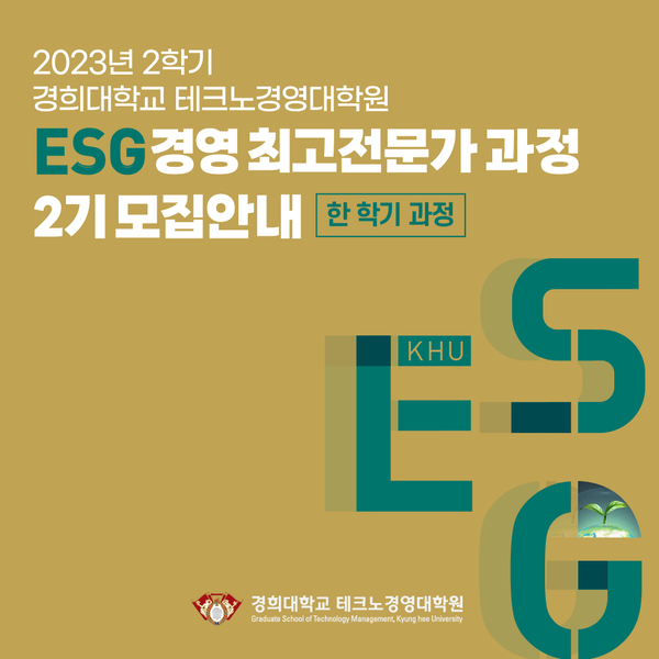 경희대학교 테크노경영대학원은 ESG 인재를 양성하기 위해 올해 3월 개설하여 진행했던 ESG 경영 최고전문가 과정의 두 번째 기수를 모집한다고 밝혔다. 최고 전문가 과정의 목적은 정책, 경제, 기술, 실무 각 분야의 ESG 전문가들의 강의와 현장 프로젝트를 통해 이론과 실무에 대한 지식을 두루 갖춘 전문 경영인을 양성하는 데 있다.