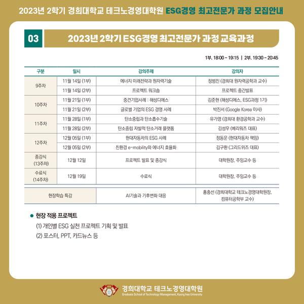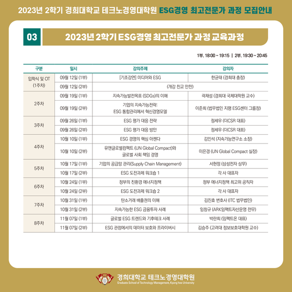 이준희 법무법인 지평 ESG센터 그룹장은 ‘ESG 통합관리에서 혁신경영모델’이라는 주제로 ESG를 실질적으로 내재화하는 방법을 설명하고 서현정 삼성전자 상무는 ESG의 주요 이슈인 공급망 관리에 대해 소개한다. 테크노경영대학원은 정부 에너지정책 최고위 공직자를 초청하여 정부의 친환경 에너지 정책에 대해서도 상세히 설명할 계획이다.