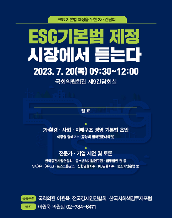 지난 20일 국회의원회관에서 이원욱 의원실 및 전경련, 한국사회책임투자포럼(Kosif) 공동 주최로 ‘ESG 기본법 제정을 위한 2차 간담회’가 열렸다. ESG 기본법에 대한 기업의 관심이 크게 쏠리며, 향후 정책방향에 대한 궁금증이 터져나오고 있다.