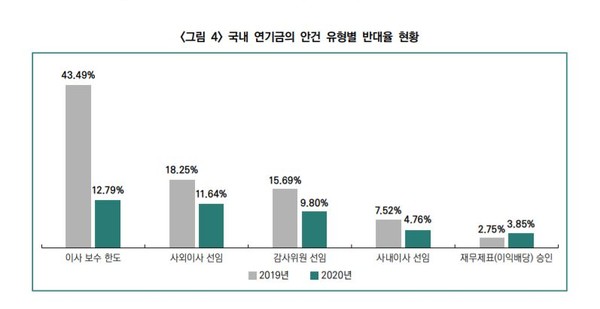 한국기업지배구조원은 보고서를 통해 "연기금별 특징을 살펴보니 국민연금은 이사보수 한도 안건에 대한 반대율이 가장 높았고, 사학연금과 공무원연금은 사외이사 선임 안건에 대한 반대율이 가장 높았다"고 밝혔다.