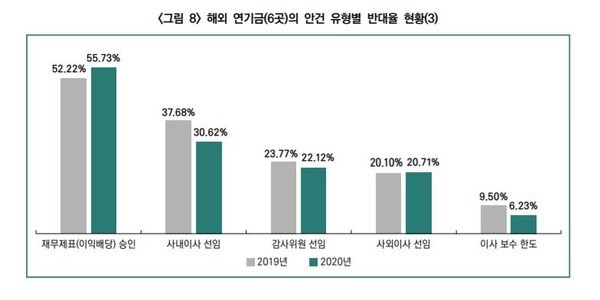 한편, 해외 연기금 6곳(CalPERS, CalSTRS, SBA, CPPIB, OTPP, BCI)의 의결권 행사 평균 반대율은 25.07%로 전년(23.48%) 대비 소폭 증한 것으로 나타났다. 이는 국내 연기금의 평균 반대율(18.61%)보다 높은 수준이다.