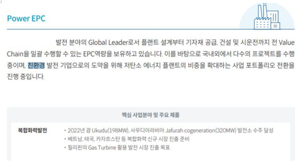 에너지 업체 D사의 경우 “친환경발전 기업으로의 도약을 위해 사업 포트폴리오 전환을 하겠다”고 명시하고 있으며, 바로 아래 핵심 사업 분야로 복합화력발전을 예로 들고 있다. 실제 복합화력발전의 경우 LNG를 기반으로 하며, 석탄화력발전보다 이산화탄소배출량이 낮고 발전효율이 높다. (석탄화력 40%, 복합화력 60%)
