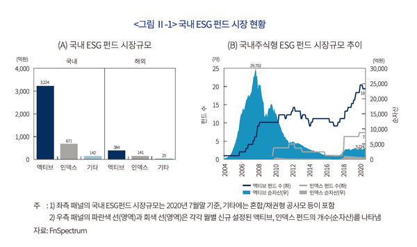 국내의 경우 2020년 7월말 현재 국내 ESG 펀드는 총 41개로, 순자산 규모는 4618억원으로 추정된다. 국내투자 펀드(31개) 4038억원, 해외투자 펀드(9개) 550억원으로, 국내투자 비중이 87% 이상을 차지한다. 또한 국내투자 펀드 가운데 채권형, 혼합형 공모펀드 등이 3.5%(142억원), 주식형 공모펀드는 96.5%(3895억원)로 국내펀드의 대부분이 주식에 투자된다.
