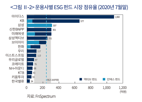 16개사 ESG 펀드를 개별적으로 보면, 마이다스, KB, 삼성, 미래에셋, 신한BNPP 등 상위 5개사의 비중이 약 70% 수준(순자산 기준)으로 시장 집중도가 높은 편이다. 특히 삼성, 미래에셋은 국내 ETF 시장의 63%(2020년 7월말 순자산 기준)를 점유하는 대형 운용사들로, 초기 ESG ETF 시장을 선점하기 위해 관련 상품을 적극적으로 출시하고 있는 것으로 보인다.