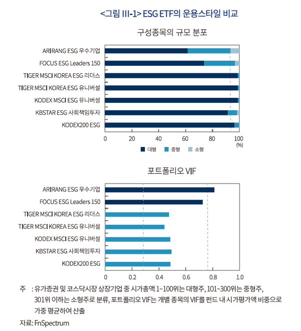 운용스타일을 보면, ARIRANG ESG 우수기업과 FOCUS ESG Leaders150을 제외한 모든 펀드가 대형주에 92%이상 투자하고 있다. 펀드의 포트폴리오를 보면 VIF(Value Inclusion Factor)가 이 두 ETF를 제외하고 0.4~0.5 수준으로, ESG ETF의 대부분이 대형ㆍ혼합주 또는 대형ㆍ가치주 위주로 운용되고 있다.