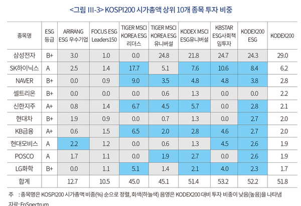 KOSPI200 시가총액 상위 10대 종목과 ESG ETF간 투자 비중