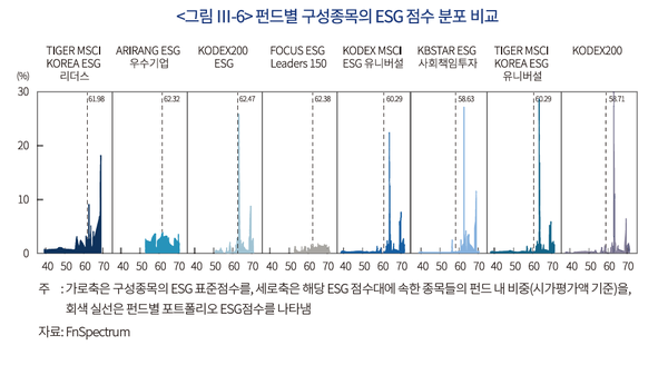반면, 오른쪽 3개 ESG ETF는 그 분포가 KODEX200과 유사할 뿐 아니라 ESG 점수가 40점 미만인 최하위 종목에도 펀드 자산의 상당 부분이 투자되고 있음을 확인할 수 있다.