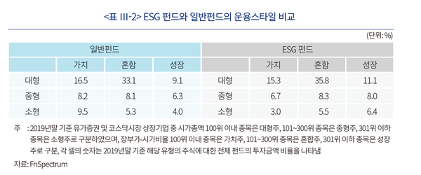 이번 보고서에는 ESG 펀드도 분석대상에 포함됐다. ESG 펀드 18개와 일반펀드 272개를 비교한 결과, ESG 펀드는 일반펀드와 마찬가지로 총자산의 60% 이상이 대형주에 편중되어 있었다.