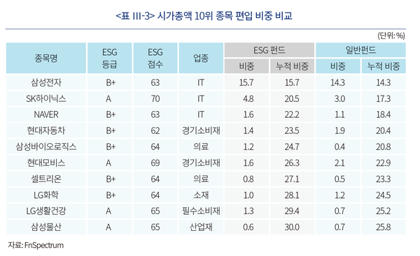 ESG펀드, 시가총액 10위 종목 편입비중 일반펀드보다 4.2% 높아