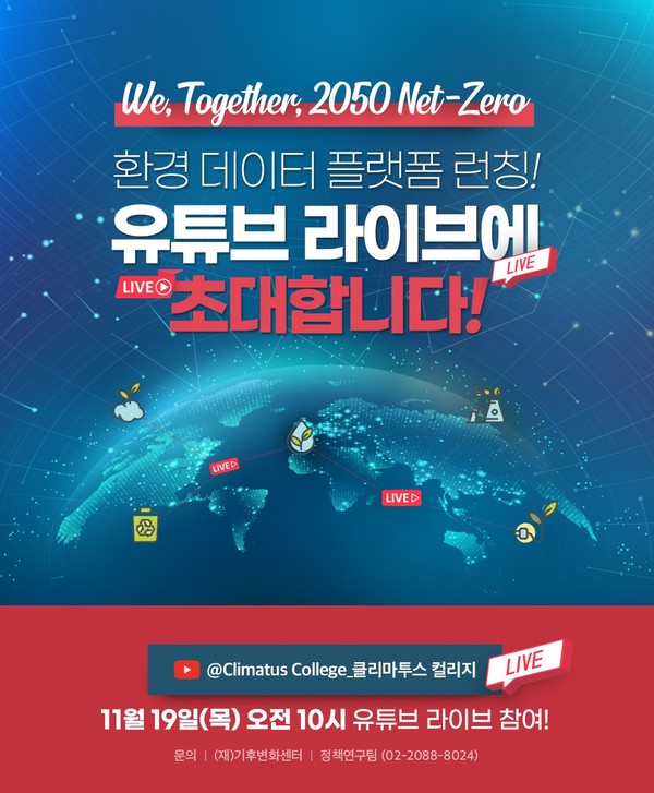 재단법인 기후변화센터(명예이사장 강창희, 이사장 유영숙)는 오는 19일(목) '환경데이터 플랫폼' 론칭을 기념한 유튜브 라이브를 실시간 방송한다고 밝혔다.