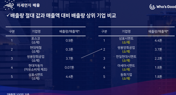 매출액 대비 배출량 상위기업의 경우 1~5위가 모두 소재 기업으로, 삼표시멘트, 쌍용양회공업, 한일현대시멘트, 아세아시멘트, 동화기업 등의 순으로 나타났다. 포스코의 경우 매출액 대비 배출량이 0.9톤인데 반해, 삼표시멘트는 4.4톤으로 꽤 큰 차이가 났다.