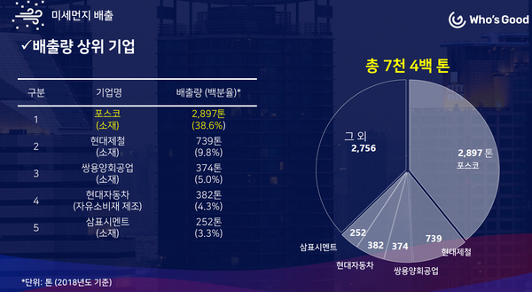 미세먼지 배출량의 경우, 총 7400톤이었는데 여기서도 포스코가 2897톤(38.6%)으로 1위를 차지했다. 현대제철, 쌍용양회공업, 현대자동차, 삼표시멘트가 그 뒤를 이었다.
