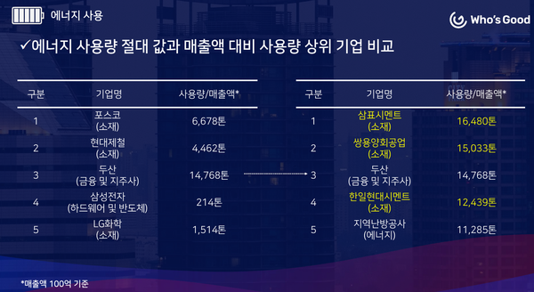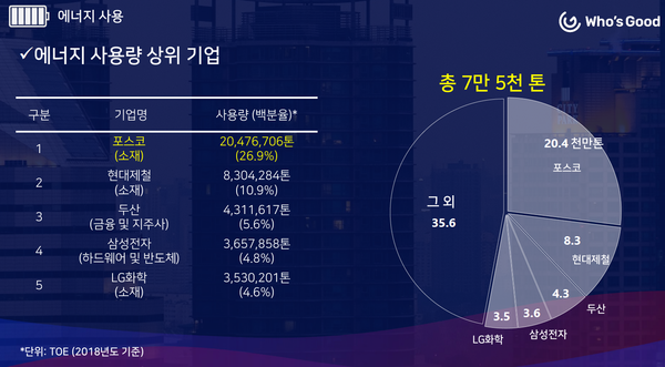 에너지 사용량의 경우, 500개 기업 중 157개 기업이 데이터를 공개했다. 공개기업의 전체 에너지 사용량 총계는 7만5000톤 가량이었고, 이중 1위는 포스코(2047만톤)으로 26.9%를 차지했다. 현대제철, 두산, 삼성전자, LG화학이 뒤를 이었다.