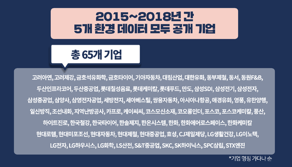 한편, 이번에 환경데이터 플랫폼에서 공개된 데이터는 2015~2018년(4년치, 공시연도 2016~2019년)에 해당하는 5가지 환경데이터로, ▲온실가스 배출량(직‧간접) ▲에너지 사용량(TOE) ▲미세먼지 배출량(ton) ▲물 재활용률(%), ▲폐기물 재활용률(%)이었다.