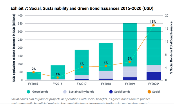 기업도 이 대열에 뛰어들었다. 뱅크오브아메리카(Bank of America)는 올해 두 개의 소셜본드를 발행했는데, 하나는 헬스케어 산업에 자금을 제공하기 위한 것이었고, 또 하나는 인종 불평등 해결 목적으로 소외계층에 포괄적인 자금대출을 해주는 것이었다. 화이자도 헬스케어 목적의 소셜본드를 발행했지만, 수익금의 사용은 저개발국 및 중진국의 백신 생산 및 글로벌 헬스 비상사태 이슈, 또 코로나 19 백신개발 자금 지원 등에 쓰인다고 밝히고 있다. 2020년에 발행된 소셜본드는 민간 금융을 통해 이루고자하는 야심찬 사회적 목적이라는 측면에서 혁명적인 것이나 다름없다.