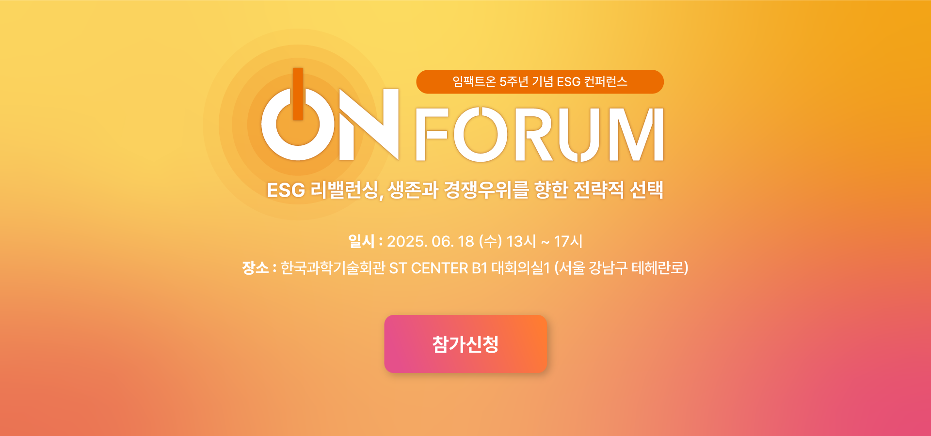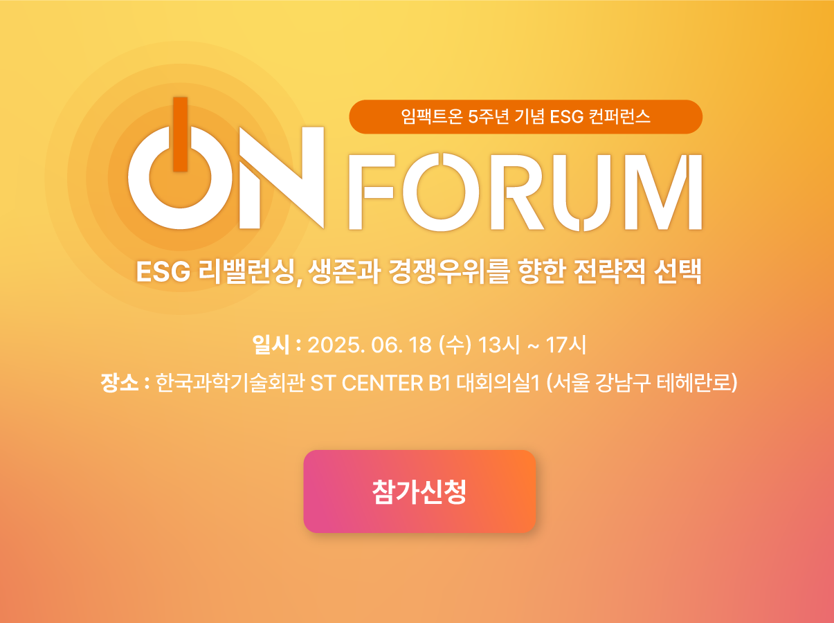 창간 5주년을 맞은 임팩트온은 『On Forum: ESG 리밸런싱, 생존과 경쟁우위를 향한 전략적 선택』을 통해, 기업들이 가치 중심의 ESG를 실천 가능한 전략으로 리셋할 수 있도록 구체적 방향성과 실천 사례를 제시합니다.