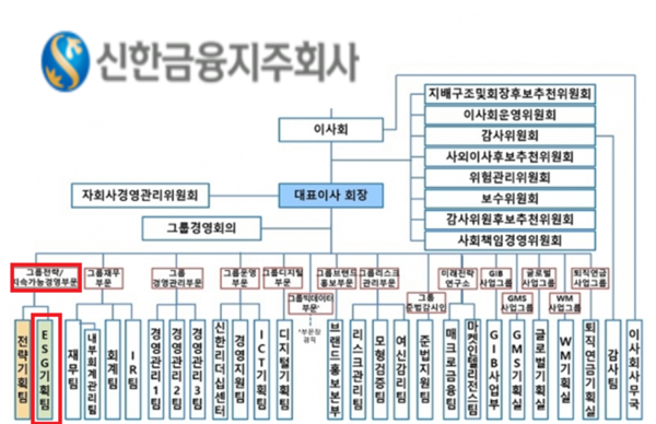 신한금융그룹은 지난해 말 그룹 전략·지속가능부문(CSSO) 산하에 ESG기획팀을 신설했다. 기존에는 전략 관련 팀 내부에서 ESG를 함께 담당했었지만 이번 조직 개편을 통해 별도 팀이 신설됐다. ESG기획팀은 부장 1명, 실무 담당 직원 4명 등 총 5명으로 구성된다. ESG 기획팀은 앞으로 그룹이 전사적으로 추진하고 있는 탄소제로 프로젝트, ESG 통합 평가모델 구축 등을 이끌 예정이다.