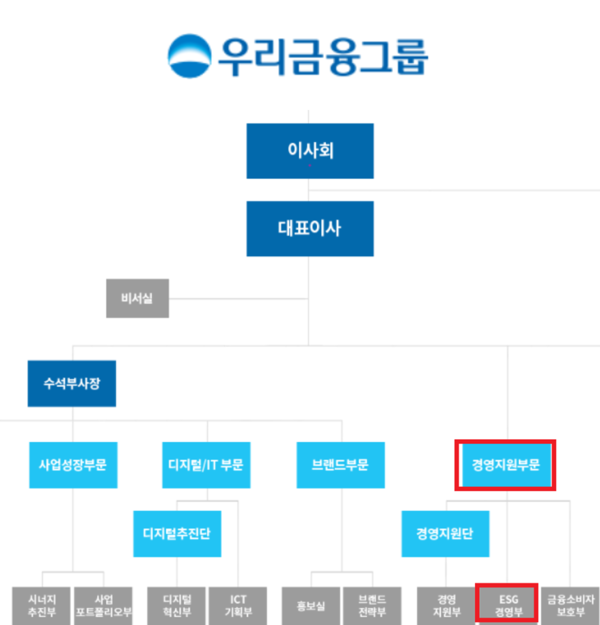 우리금융은 그룹 경영지원본부 산하에 ESG경영부를 신설했다. 그룹 차원의 ESG 전략 로드맵과 중장기 목표를 설정한다. 주요 계열사인 우리은행에는 홍보브랜드그룹을 '브랜드ESG그룹'으로 개편하고 'ESG기획부'를 신설했다. ESG경영부 총괄은 김재영 부장이 맡는다. 김 부장은 우리은행에서 새롭게 개편된 브랜드ESG그룹의 기획부장까지 겸직한다.