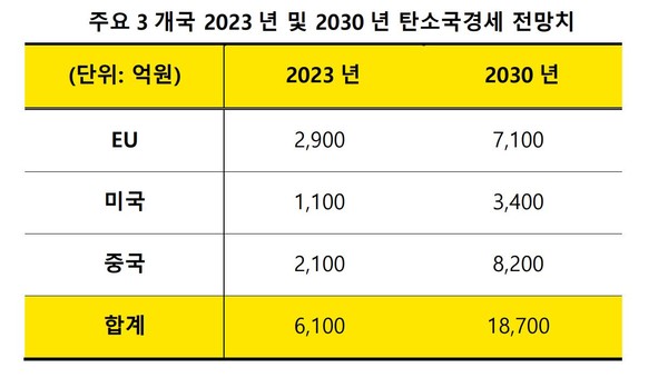유럽연합(EU)과 미국, 중국이 탄소국경세를 도입하게 되면 한국 수출업계가 부담해야 할 추가 비용이 2023년에는 6100억원, 2030년에는 1조8700억원에 이를 것이라는 예측이 나왔다.