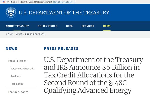 미국 재무부와 국세청(IRS)은 10일(현지 시각) 고급 에너지 프로젝트 세액 공제(48C Qualifying Advanced Energy Project Tax Credit) 프로그램의 2차 세액 공제로 60억달러(약 8조7690억원)를 배정했다고 발표했다.