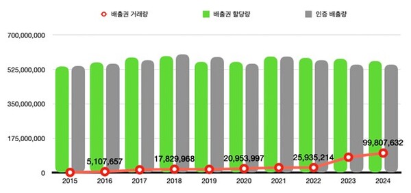한국의 배출권 시장은 할당량과 실제 배출량이 거의 동일한 수준에서 움직이고 있음을 확인할 수 있다. 2015년부터 2024년까지의 배출권 할당량, 실제 배출량, 거래량을 비교한 결과, 배출권 거래량은 할당량과 실제 배출량의 차이가 증가하는 시기에 함께 늘어나는 경향이 관측된다.