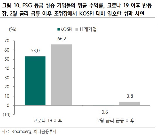 특히 ESG 등급 순위가 점진적으로 상승한 11개 기업의 성과는 두드러졌다. 지난해 3월 코로나19 이후 반등장에서 66.2%의 수익률을 기록하고, 2월 금리 급등 이후 조정장에서도 3.8%를 기록하면서 일반 기업에 비해 우수한 성과를 냈다.