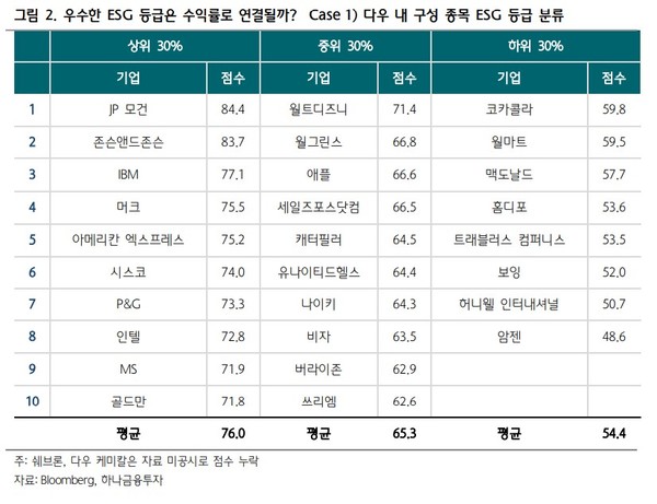 보고서는 DJSI 구성 종목을 ESG 등급 상위 30%·중위 30%·하위 30%로 분류했다. 그 결과 모두 수익률은 50%가 넘었다. 상위 기업은 평균 76%, 중위 기업은 평균 65.3%, 하위 기업은 평균 54.4%의 수익률을 낸 것이다.