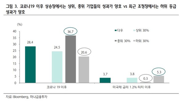 ESG 평가 대상을 전 세계 기업으로 넓혀보자 또 하나의 흥미로운 결과가 나왔다. ESG 등급이 높으면 수익률도 높을 뿐 아니라, ESG 등급에서 중간 성적만 받아도 양호한 성과를 거둔 것이었다. 이 연구원은 "ESG 등급이 매겨지기만 했어도 S&P500 대비 성과가 좋았으며, 최근 조정장에선 상위& 중위 기업들의 성과가 좋았다"고 말했다.