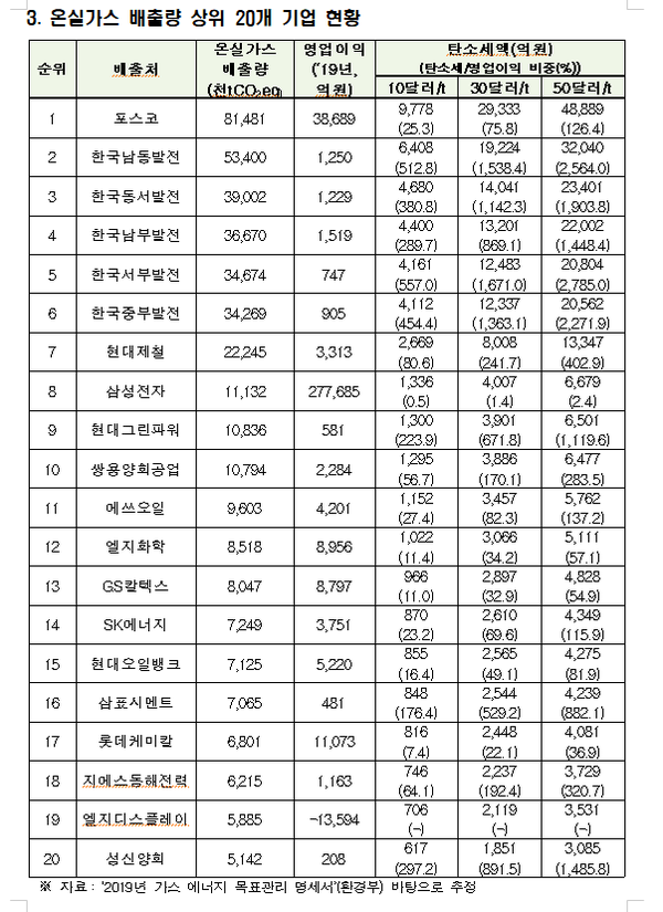 온실가스 배출량 상위 20개 기업을 살펴보면, 가장 높은 배출량을 기록한 포스코는 10달러 탄소세를 기준으로 약 1조원, 30달러 기준으로 약 3조원, 50달러 기준으로 약 5조원의 탄소세가 발생했다. 포스코의 19년도 영업이익은 약 3조9000억 원이다. 영업이익 대비 탄소세가 차지하는 비율은 각각 25%, 76%, 126%에 달했다.