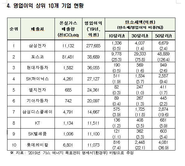 한편, 환산톤당 탄소세 30달러를 책정했을 경우 전체 탄소세액은 약 21조7600억원이 발생했고. 이는 전체 법인세 세수 대비 30%에 달했다. 배출량 상위 100대 기업으로 좁혔을 때는 약 19조5100억 원으로, 영업이익 대비 약 32%였다. 영업이익 상위 10개사를 제외하면, 이 비율은 117%로 훌쩍 높아졌다. 탄소세가 영업이익보다 더 많은 기업도 41곳이나 됐다.