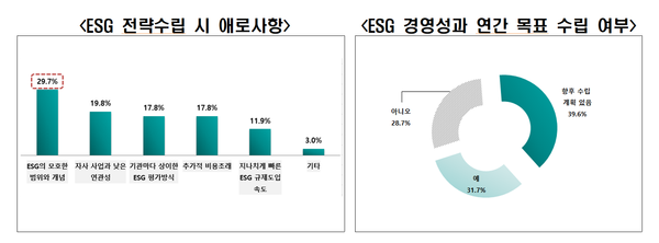관련 경영전략 수립에 있어 애로요인을 묻는 질문에 대해서는 응답자의 29.7%가 'ESG의 모호한 범위와 개념'을 꼽았다. 기타 애로요인으로는 자사 사업과 낮은 연관성(19.8%), 기관마다 상이한 ESG 평가방식(17.8%), 추가비용 초래(17.8%), 지나치게 빠른 ESG 규제도입 속도(11.9%) 등이 지적됐다.