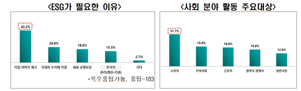ESG가 필요한 이유로는 '기업 이미지 제고를 위해서'라는 응답이 많았다. 세부적으로는 '기업 이미지 제고 목적' 43.2%, '국내외 수익에 직결되기 때문' 20.8%, 'ESG 규제부담 때문' 18.0%, '투자자 관리(개인‧기관)를 위해' 15.3% 순이었다.