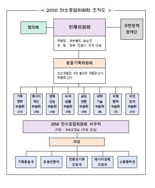 탄소중립위원회는 위원들이 참여하는 위원회와 국무조정실 2차장이 사무처장인 사무처로 구성된다. 위원회는 한정애 환경부 장관, 문승욱 산업통상자원부 장관 등 국무위원과 구윤철 국무조정실장 등 중앙행정기관장 18명과 산업계·학계, 청년과 청소년 민간위원 77명이 참여하는 심의·의결 기구다.