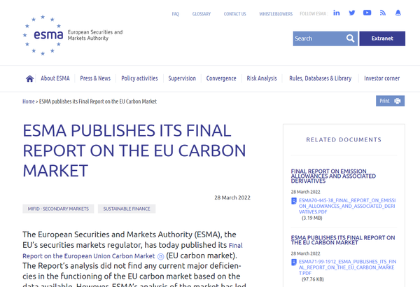 한편, EU 정책입안자들은 EU 수준에서 탄소시장에 대한 중앙집중화된 시장모니터링이 필요하며, 또 이미 시행중인 탄소 파생상품 보유에 대한 위치 제한의 필요성이 있다고 ESMA는 밝혔다.