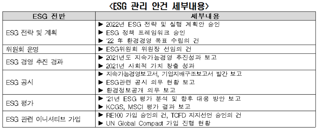 환경 분야 논의안건에는 탄소전략 안건 58.6%(17건), 친환경사업 관련 안건 41.4%(12건)이 있었다. 사회 분야 논의안건 중에서는 사회공헌 안건이 68.7%(46건)로 가장 비중이 높았으며 다음으로 안전 및 보건 17.9%(12건), 인권 6.0%(4건) 등의 순이었다. 투자·경영 논의안건 중에서는 투자 및 출자 안건 36.8%(42건), 기타 사업 관련 안건 18.4%(21건), 경영계획 안건 16.7%(19건)의 순으로 경영 일반 분야에서도 ESG를 고려하고 있는 것으로 나타났다.