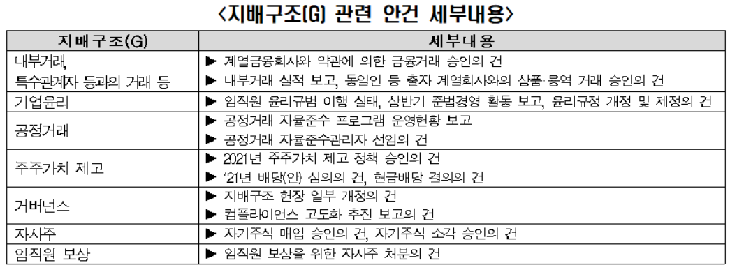 한편 ESG 관리를 제외한 ESG 중 G 부분의 의결 안건 비중이 높았던 이유는 해당 분야에 법으로 규제되는 사안이 다수 포함된 점 등을 꼽을 수 있었다.