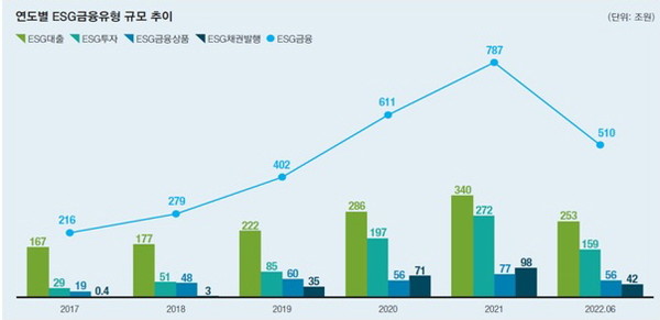 전년 대비 비교했을 경우, ESG금융의 모든 유형에서 15% 이상의 높은 성장률을 보여주고 있으며, 금액 기준으로는 ESG투자가 74조9000억원으로 가장 큰 규모로 증가했다. 하지만 국내 ESG금융 규모는 2022년 6월말 기준 510조원으로 경기침체로 올해 말까지의 ESG금융 규모 증가세는 둔화될 전망이다.