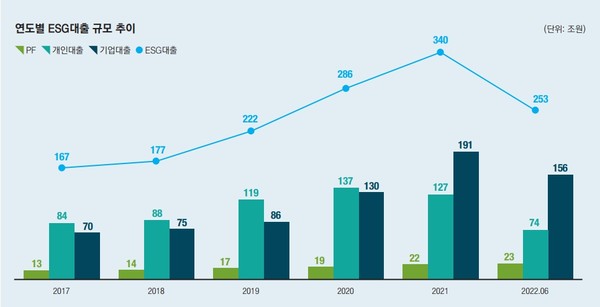 ESG금융 분야별로 보면, ESG대출은 ESG투자와 더불어 ESG금융을 이끌고 있다. 2021년 기준, ESG대출 규모는 340조원으로 전년 대비 19% 성장했고 2017년 대비 104% 성장했다. 최근 5년간 연평균 성장률은 20%에 달한다.
