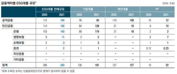 ESG금융 유형별로는 ESG대출이 340조원, ESG투자가 272조원, ESG금융상품은 77조원, ESG채권발행은 98조원으로 모든 ESG금융은 2020년 대비 최소 15% 이상 성장한 것으로 드러났다. 유형별로 보면, 대출이 19%, 투자가 38%, 금융상품이 37%, 채권발행이 38% 성장했다.