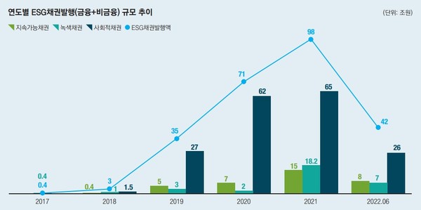 ESG채권발행의 유형별로는 사회적채권 65조원, 녹색채권 18조원, 지속가능채권 14조8000억원, 전년 대비 성장률은 녹색채권이 885%으로 큰 폭의 성장을 보이고 있다.